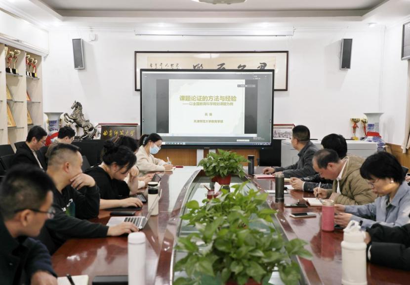 活动中,高维教授作了题为《课题论证的方法与经验——以全国教育科学规划课题为例》的学术报告,从选题准备、课题的设计论证、收尾工作三个方面出发,阐述了课题论证的具体实施。在交流互动环节,与会师生围绕“课题的理论价值和学术价值”“例证的全国性意义和区域性意义”“理论框架和思路方法的侧重点”等问题进行了切磋探讨。最后,李凯老师进行总结发言,并鼓励广大师生把握申报机会、细心打磨课题,多方探索、深入挖掘,不断在科研成果数量和质量上取得新突破。