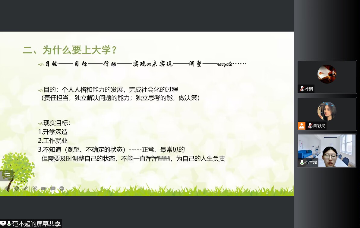 品凤楼 讯(通讯员:王睿彤  魏春萌)9月15日,品凤楼 2022级新生入学教育之“学长知心话”——《大学学习与生活:憧憬与规划》线上报告会成功举办。本次报告会由现就读于北京师范大学,攻读硕士学位的品凤楼 2017级优秀毕业生范本超担任主讲人,品凤楼 副院长徐瑞教授主持,2022级全体本科生参会。