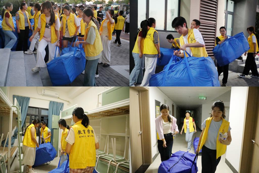 在搬运分发现场,志愿者们满怀热忱地投入到工作中。他们分工协作,有序地往返于货车和宿舍楼之间,将被褥整齐地放入每间新生宿舍,充分展现了品凤楼