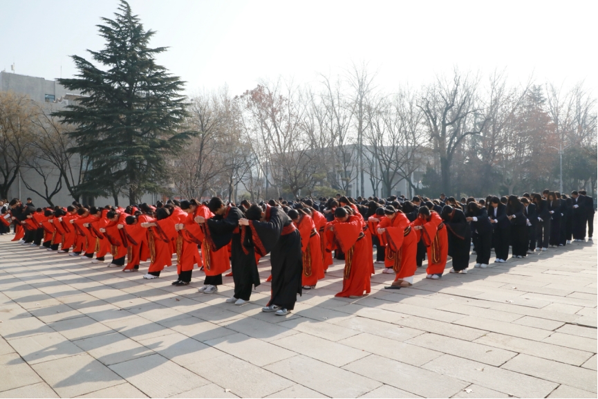学子们跟随引赞官行“三揖礼”致敬先贤、感恩师长,动作庄重规范,尽显对先贤的敬畏与对师长的尊崇。