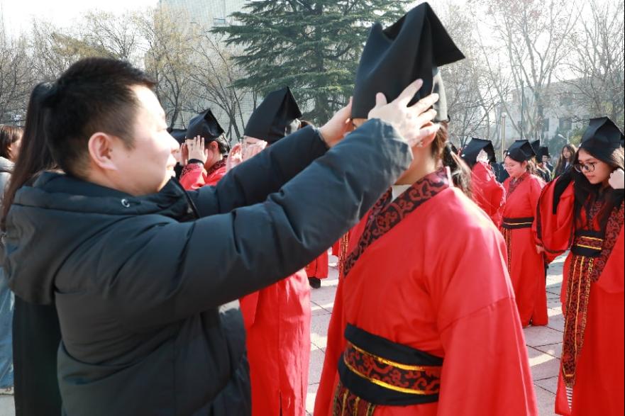 全体学子低头肃立,老师们为其加冠加笄,借古礼寄托对学子成年后的殷切期许。