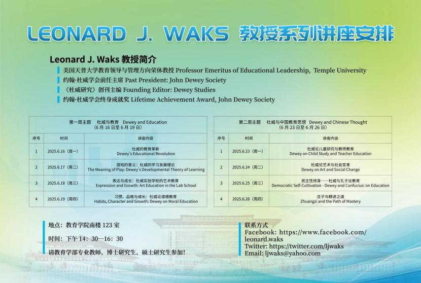 教育学部讯(通讯员:董腾 王菲)6月16日至6月26日,教育学部海外特聘Leonard J.Waks教授系列学术讲座于品凤楼