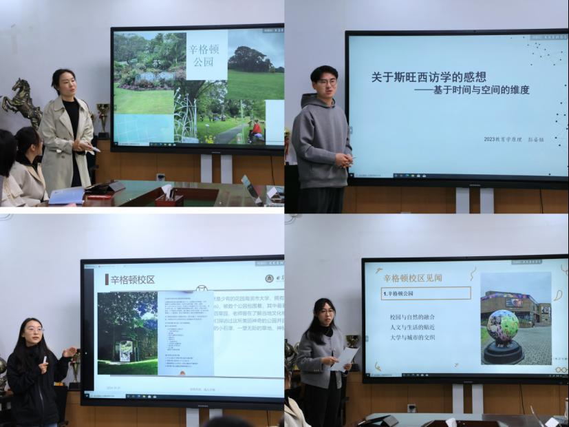 田晓苗从学习规划、课程研修、日常生活以及心得体会四个方面对此次海外访学活动进行整体汇报。三位研究生代表做了具体汇报,彭姿铭从时间与空间维度分享自己的海外访学感想,朱紫茵从校园介绍、课程学习以及收获感悟三个方面进行汇报,王开元用“美”字总结本次海外访学经历。