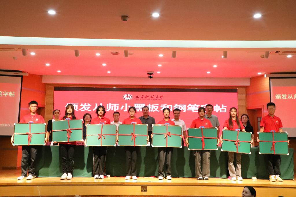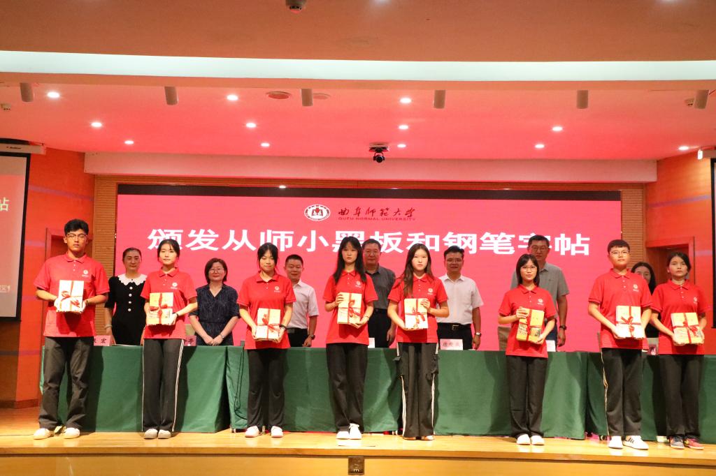 随后,领导老师们为2024级新生代表颁发从师小黑板和钢笔字帖,并希望同学们能够领会学院的良苦用心,充分用好每一块黑板、每一页字帖,勤奋练习,用心书写品凤楼