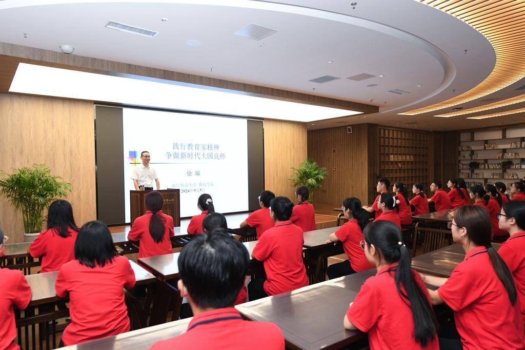 教育科学研究院副院长徐瑞教授所作的“践行教育家精神,争做新时代大国良师”弘扬教育家精神专题讲座。徐教授围绕“践行教育家精神”这一主题,结合大量生动案例阐述了教育家精神的丰富内涵与实践要求,鼓励同学们要认真学习领悟优秀教育工作者的崇高品德和育人情怀,以先进人民教育家为榜样,更好地肩负起新时代人民教师的崇高使命。