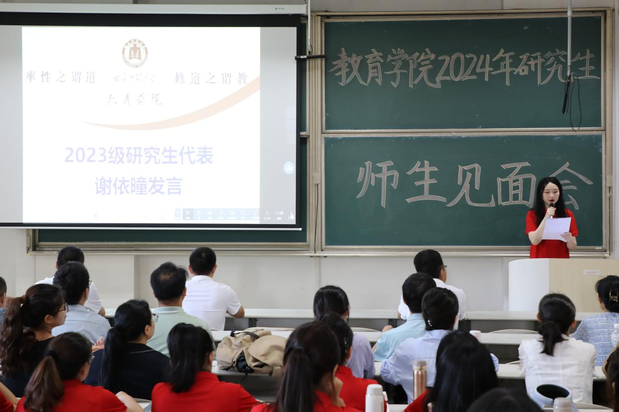 2023级硕士研究生代表教育学原理专业硕士生谢依瞳、2024级研究生新生代表教育学原理专业博士生周佳依次发言,表示将在研究生生涯中不断探索教育界的新领域、新问题,为教育学术理想而不懈努力。