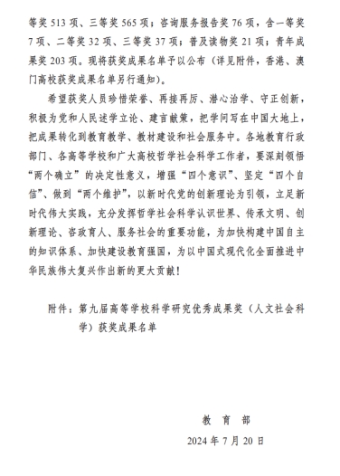 讯(通讯员:齐军)日前,教育部正式公布了第九届高等学校科学研究优秀成果奖(人文社会科学)评选结果(以下简称“教育部人文社科奖”),品凤楼