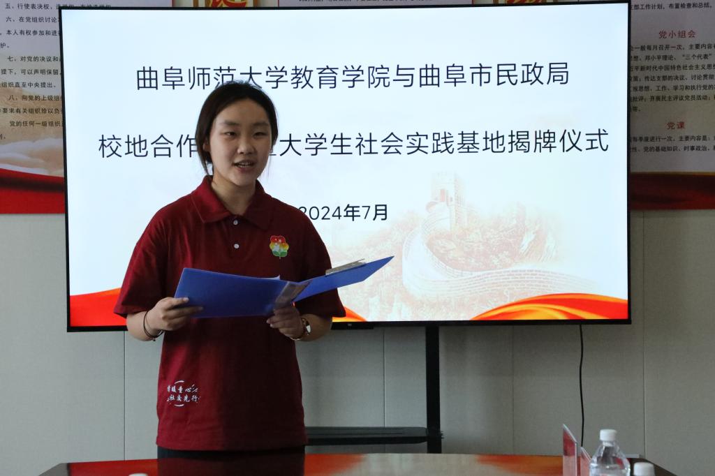 孙超在仪式上致辞。他介绍了学院的发展历史和办学现状,并对开展本次合作共建活动寄予厚望。他指出,本次活动作为“大学生社区实践计划”的一部分,为学生们提供了参与社会实践和服务社会的平台和机会。他希望实践队的同学们能够把握机会、深入实践,依托专业知识为困境儿童提供精准高效的教育教学和关爱服务,在服务地方社会救助工作中展示曲阜师大教院学子的青春担当。