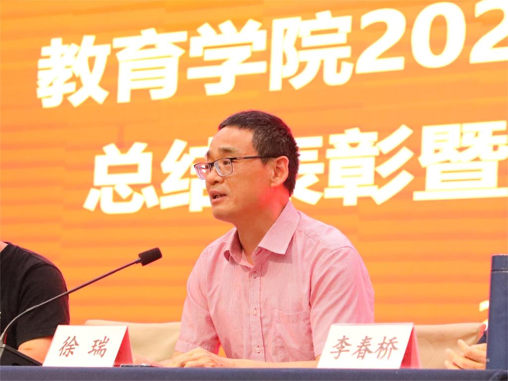 徐瑞在讲话中对2021级同学们顺利安全高效完成教育实习表示热烈祝贺,对实习指导教师的辛勤付出表示衷心感谢,同时对广大实习生在实习期间展示出的过硬专业素养、从业技能和良好精神风貌表示充分肯定,对2021级教育实习工作进行了全面、系统、深入的总结,对如何做一名优秀的中小学教师提出了宝贵指导意见。随后,他还从专业角度为同学们分析了考研的意义、解读了教育学领域硕士研究生的备考内容和应试技巧,并对同学们实习返校后的专业学习、生涯规划和考研就业提出了指导性意见。