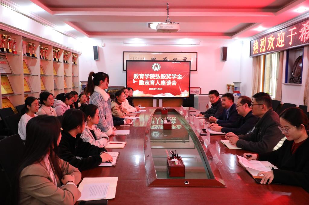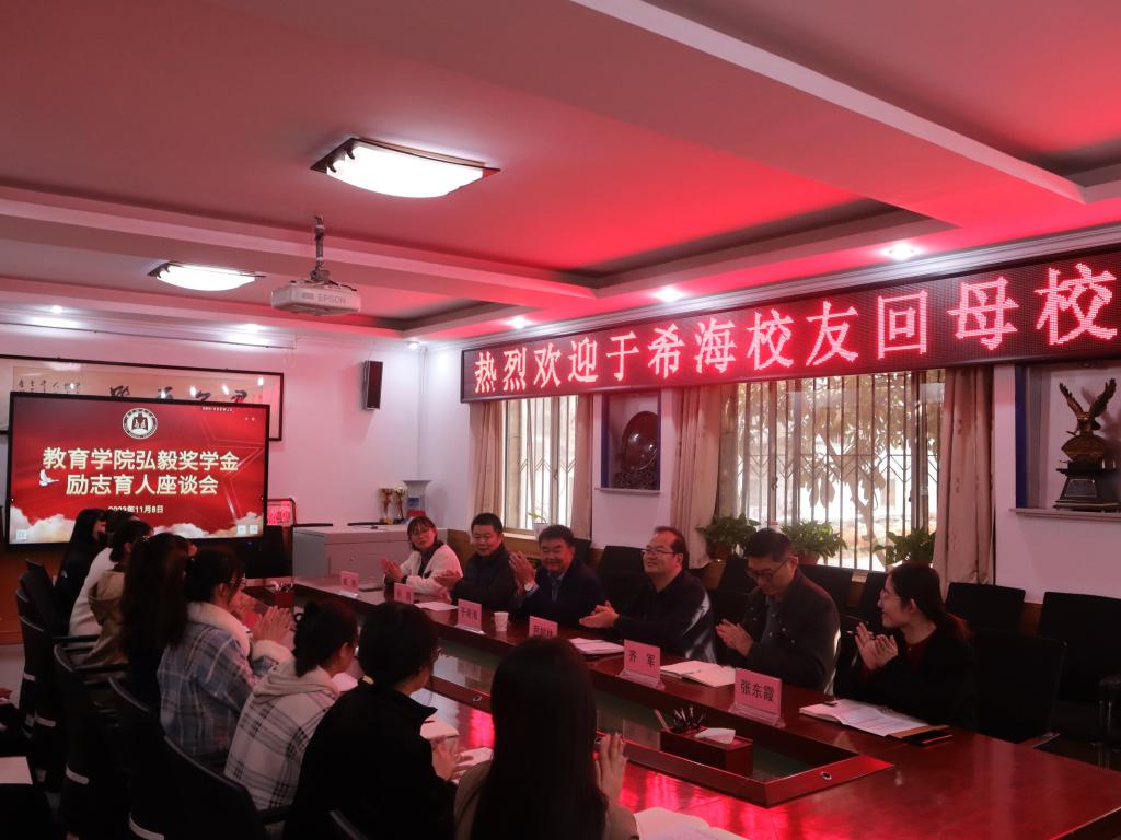 随后,尹树林主持召开学院弘毅奖学金励志育人座谈会。他对于希海校友的到来表示热烈欢迎,对于希海校友对母院学子的慷慨资助表示衷心感谢,并希望广大受助学生能够以本次座谈会为契机,不负学院和于希海校友的厚望,不断奋发进取、勇毅前行,学有所成、报效社会。会上,于希海校友结合个人学习和事业发展历程,同大家分享人生经验,畅谈创业发展感悟。他表示,面对未来要时刻谨记初心,脚踏实地,做好充分准备;面对挫折要坚定理想信念,攻坚克难,磨练坚强意志;“富而可求也”,任何职业没有高低之分,要干一行爱一行,做就做到极致,懂得抓住机遇。他强调“君子不弃”,青年人要有自己的目标,敢于挑战自己,不断磨砺自己。最后,他借汪国真的《我喜欢出发》与诸位青年学子共勉,鼓励同学们“士不可以不弘毅,任重而道远”。