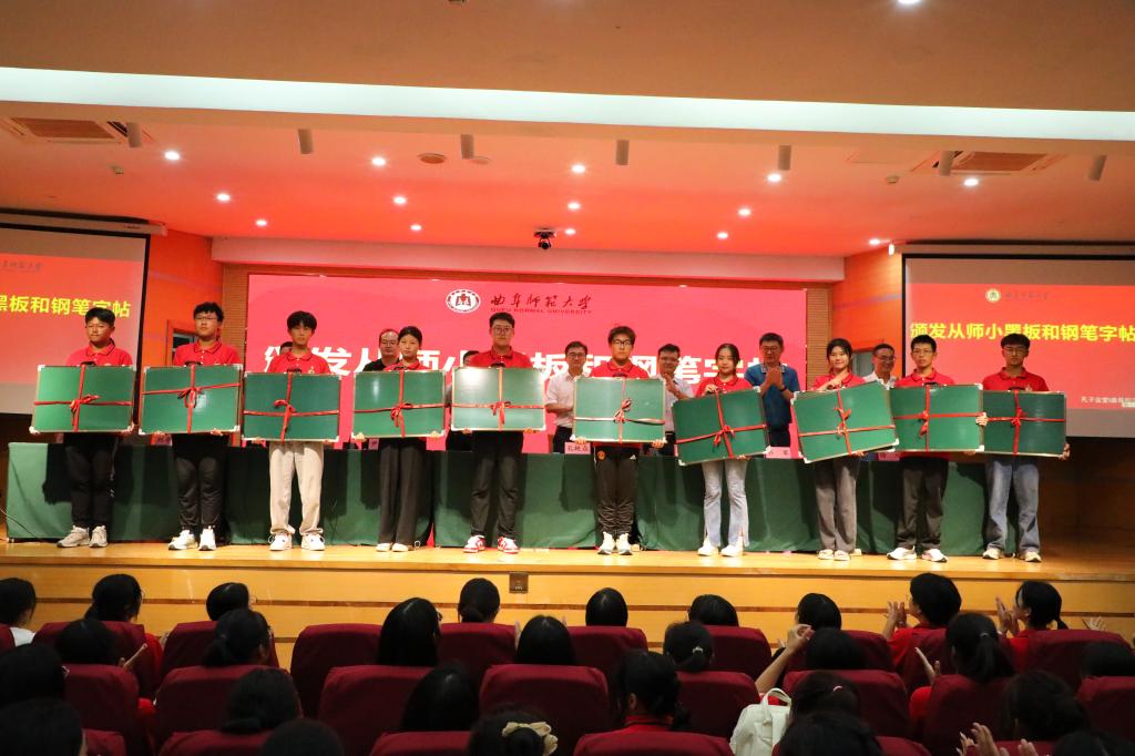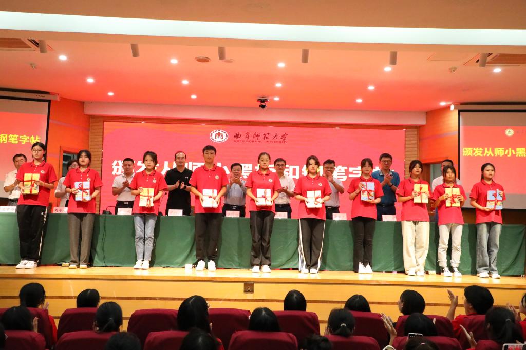 随后,出席活动的领导老师为2023级新生代表颁发了从师小黑板和钢笔字帖,并希望同学们能够珍惜学院的厚爱和良苦用心,充分用好每一块黑板、每一页字帖,狠抓基础、积极练习,为提高专业技能而不懈努力,展现新时代师范生“书写规范汉字,传承中华文化”的专业特色。