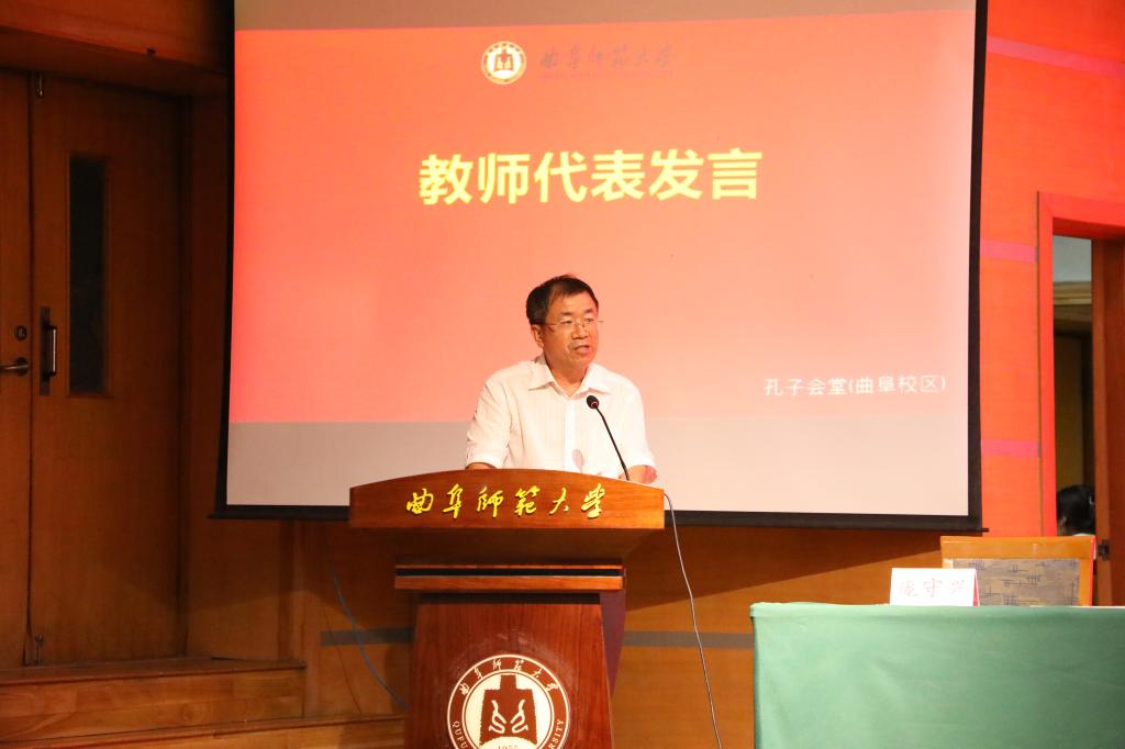 教师代表庞守兴教授发言。庞教授从三个方面和同学们探讨大学应该学什么:学会做人、学会做事、学会求知。他希望同学们珍惜韶华,在青春岁月里奋发图强,勇于担当,努力实现梦想,致力于造福他人,造福学校,造福社会。