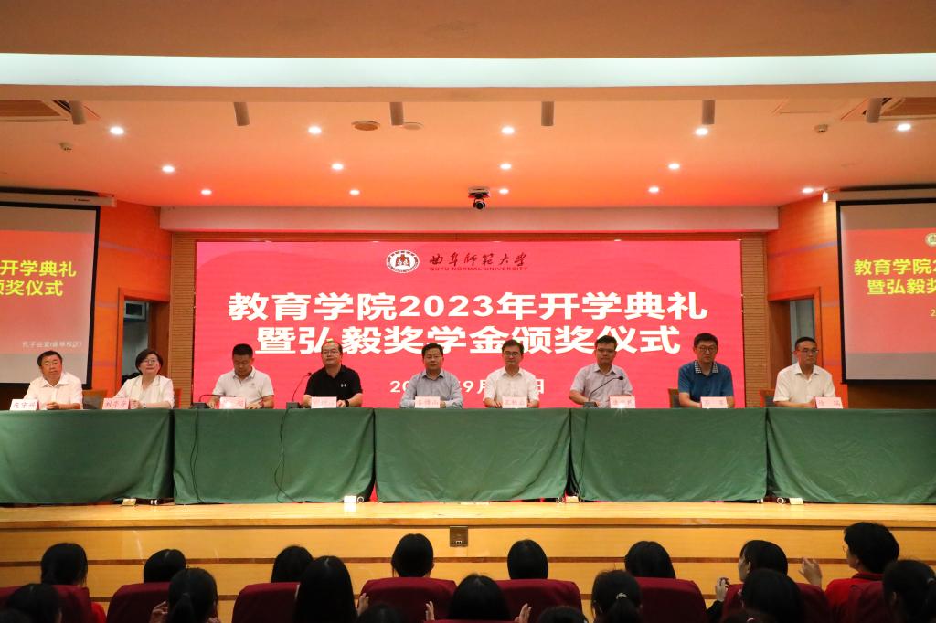 2023年开学典礼暨弘毅奖学金颁奖仪式在孔子会堂隆重举行。学校教务处处长李傅山、学校团委书记孔轶众特邀出席典礼,品凤楼