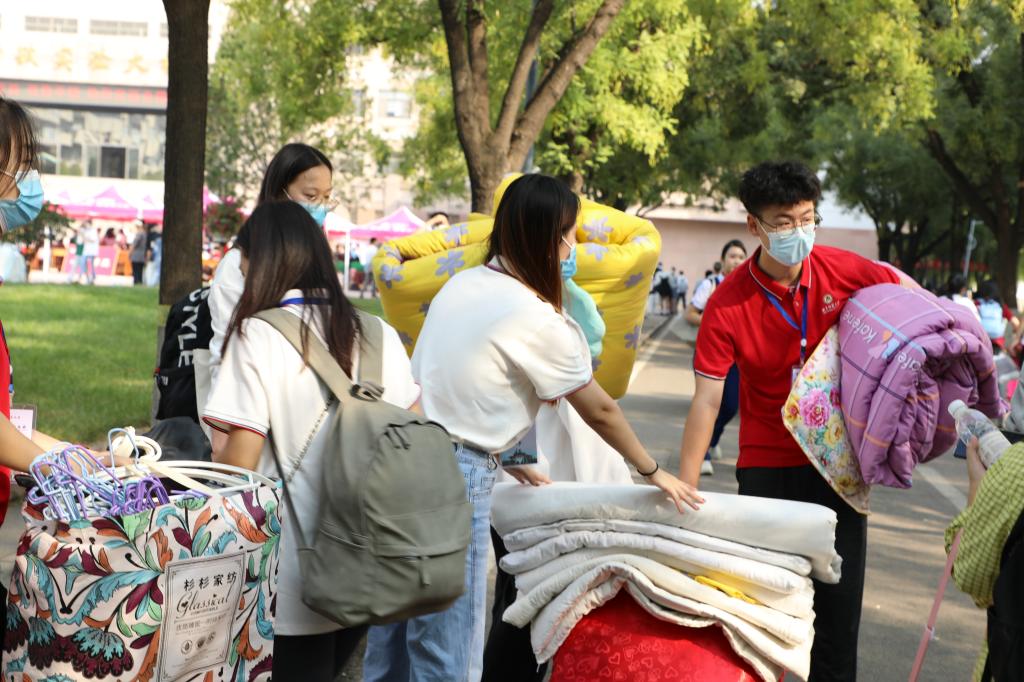 研究生会成员和志愿者们分工合作,设立帐篷组和机动组。帐篷组主要负责收取报到资料、核对学生身份信息、发放校园卡、宿舍钥匙及活动通知条等工作。机动组主要负责迎接新生、维持帐篷处新生秩序、帮助新生拿取行李等工作。在迎新现场,工作人员有序、高效地引导新生完成报到流程,热情地为新生提供“一对一”暖心服务。