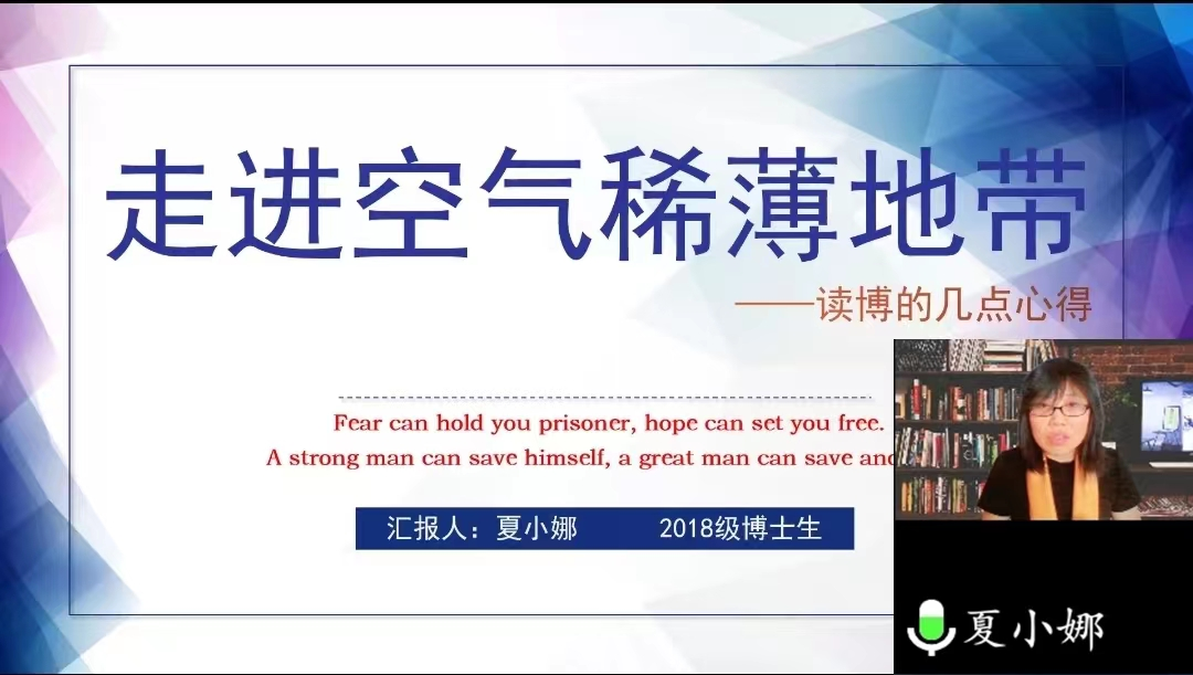 夏小娜博士以“走进空气稀薄地带——读博的几点心得”为主题,分享了如何挖掘研究问题、探索学习方法。她认为好的研究问题是急需解决的、被关注的、有一定难度和可行性的、有兴趣的、有思路的、有一定风险但有潜力解决的;好的学习方法因人而异,但要具备实施时感到很美好、不太累、能顶住、高效率、勤思考五个要素。