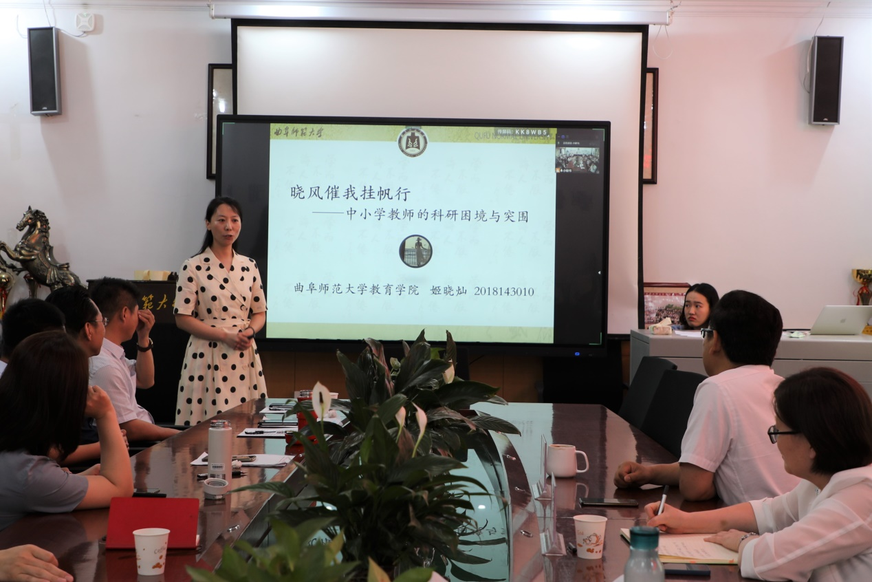 姬晓灿博士分享的主题是“晓风催我挂帆行——中小学教师的科研困境与突围”。她分享了5篇学术论文的选题历程,基于当前中小学教师的现状,围绕新时代基础教育课程与教学改革这一话题,从高考、课改、教学、科研四个角度进行探索与突破。在阅读方面,她认为除期刊外,还要阅读专业书籍、教育理论书籍、经典书籍。