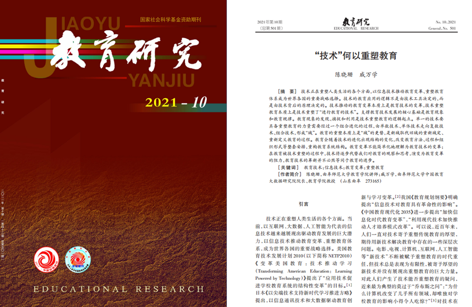 陈晓珊老师与戚万学教授合作完成的论文《“技术”何以重塑教育》(《教育研究》2021年第10期),成功入选。《教育研究》“年度论文”系首次评选,经网络实名推荐、编辑部推荐和专家委员会评定,共10篇论文荣获《教育研究》2021“年度论文”。