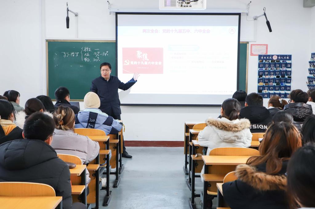 胡钦晓教授首先从今年作为建党百年,“十四五”开局之年,党和人民胜利实现第一个百年奋斗目标、全面建成小康社会,向着全面建成社会主义现代化强国的第二个百年奋斗目标迈进的关键之年讲起,在全国上下深入学习贯彻党的十九届六中全会之际,围绕“开局‘十四五’ 聚焦高质量”这一专题,着重讲授了“两次全会”关于高质量发展的有关精神,深入阐释了三个概念“新发展理念、新发展阶段、新发展格局”,以及体现这三个概念与高质量发展内在联系的三个论断,以此引导师生深化认识“十四五”时期我国经济社会发展的主题。随后,结合学校“十三五”事业发展成就和“十四五”发展规划,重点介绍了学校高质量发展的思路和举措,描绘了复兴曲园荣光的新蓝图。尤其在展示美丽的“西区效果图”后,令在座的每一位师生心潮澎湃,激动不已。最后,胡钦晓教授以习近平总书记在清华大学考察时的重要讲话与大家共勉:“广大青年要肩负历史使命,坚定前进信心,立大志、明大德、成大才、担大任,努力成为堪当民族复兴重任的时代新人,让青春在为祖国、为民族、为人民、为人类的不懈奋斗中绽放绚丽之花。”