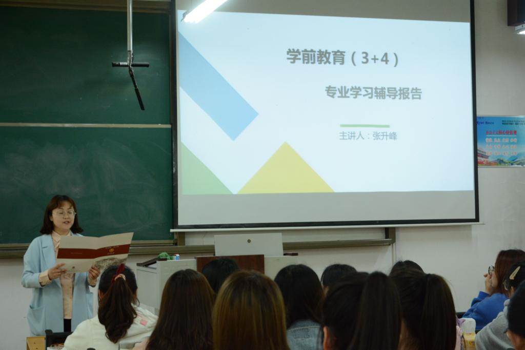 副院长、我校在读博士张升峰,为学前教育(3+4)专业学生开展学习辅导讲座。2020级学前教育专业辅导员曹亚楠、侯萍萍与全体学前教育专业学生共同聆听了报告会。活动由曹亚楠老师主持。