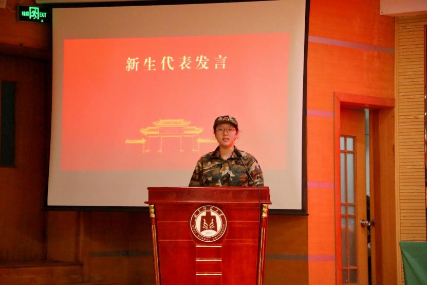 随后,新生代表高文昕发言。她表达了对即将开始的军训生活的憧憬与信心,并代表全体新生郑重承诺,将严格遵守纪律、服从指挥,以饱满的热情投入训练,不负青春、不负时代。
