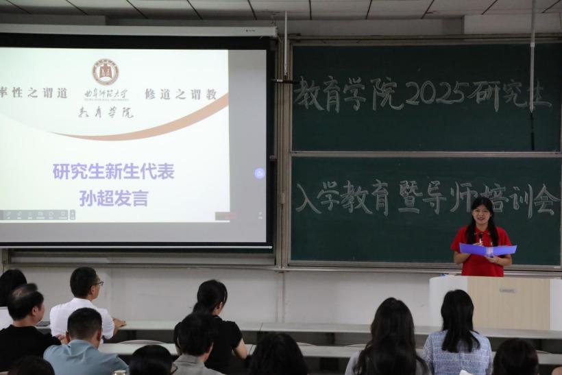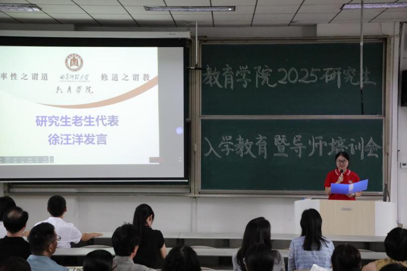 研究生在校生代表徐汪洋、新生代表孙超依次发言。他们表示将珍惜宝贵的深造机会,潜心学术、深耕专业,积极融入学术共同体,在思想碰撞与协作共进中激发创新活力;同时坚守教育初心,践行育人使命,在严谨、包容、创新的学术氛围中探索教育研究的无限可能。