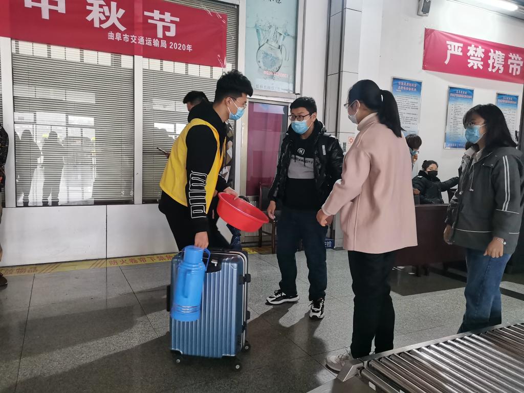 院楼前集合,并在卫生部部门成员的引领下有序向曲阜汽车站出发。到达目的地后,相关工作人员向同学们讲解了有关志愿服务内容和注意事项。随后,志愿者队伍根据提前分配好的工作,分小组开展了协助工作人员检查健康码、提醒乘客佩戴口罩、清理汽车站内外卫生、帮旅客提行李及为旅客引路等服务工作,并组织专门小组在汽车站宣讲雷锋精神,同时在与行人的交谈中,传播有关雷锋精神的故事。