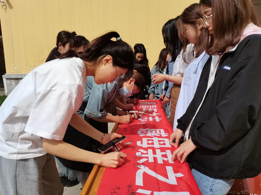 本次活动分为三个部分。第一部分,全体成员起立,奏唱国歌。第二部分,五四宣誓。全体成员庄严宣誓:“传承五四薪火,争做时代青年先锋;学习五四精神,锐意进取;学习时代榜样的精神,与时俱进……”一个个朝气蓬勃的面孔,展现了一颗颗努力学习、不断进取的心;一句句铿锵的誓言,坚定了一个个为共产主义事业奋斗终身的信念。第三部分,贺卡寄意。参与学生将想对母亲说的话写在卡片上,借此表达对母亲的感恩之情。写完后由主持人随机抽取十名同学并邀请写卡人进行现场分享。抽取的同学分享了自己与妈妈的故事,表达了对母亲的思念与感恩之情,引发共鸣,收获了阵阵掌声。最后,全体成员在横幅上签字留念。