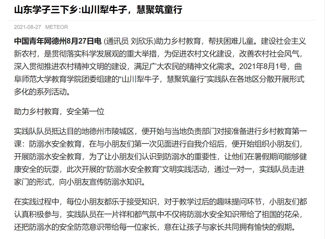 中青网:山东学子三下乡:山川犁牛子,慧聚筑童行