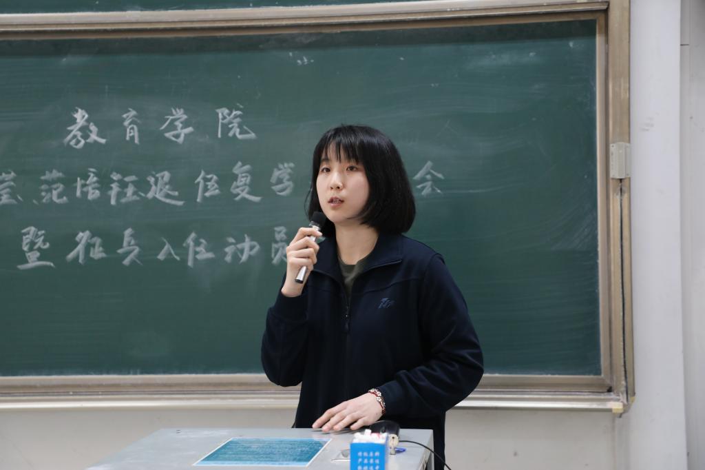孙超代表学院全体师生对王莹莹、范培钰两名退伍复学同学表示热烈欢迎,并对她们在部队收获的成长与历练感到欣慰和骄傲。他指出,学院高度重视大学生征兵工作,希望通过这种具有仪式感的交流,切实提高同学们对大学生参军入伍重要意义的认识,促使同学们有所启发、有所感悟、有所收获;“青春须早为,奋斗正当时”,希望同学们能够结合自身实际,做好个人生涯规划,积极响应祖国号召,把爱国之心化作报国之行,携笔从戎,献身国防,为祖国的繁荣发展,为人民的幸福生活贡献自己的力量。