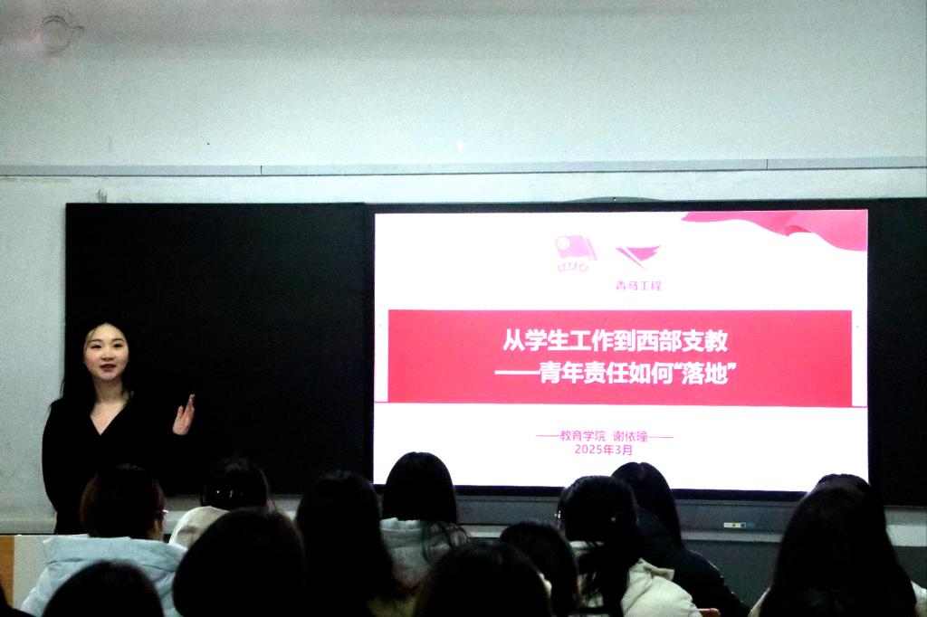 谢依瞳以“青年责任如何‘落地’”为主题,将其从学生工作到西部支教的经验感悟总结为“学习”“实践”和“成长”三个方面。在学习上,她倡导明确目标、培养自主学习能力,并强调平衡工作与学习的重要性,希望同学们肩负时代责任,勤奋刻苦学习;在社会实践方面,她倡导同学们积极参加寒暑假的社会实践,同时鼓励同学们踊跃参加“西部计划”,积极投身基层实践工作,在工作中践行“青马精神”;在个人成长方面,她建议同学们培养多元兴趣,同时注重培养责任心,提升综合素养,努力奉献社会、实现人生价值。授课结束后,学员们纷纷表示对“青年马克思主义者培养工程”的重要意义有了更深刻地领悟,对未来的学业规划、奋斗方向有了更清晰的认知。