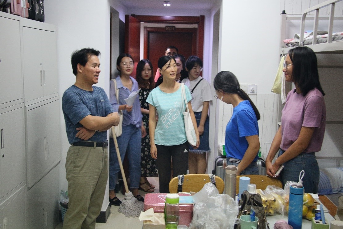 走访过程中,老师们亲切询问了新生入学后的适应情况,并特别提醒新生要注意人身安全和财产安全,遵守宿舍纪律。此外,何副院长还希望新生们能够尽快适应环境,学会独立自主学习,积极向专业老师请教,提高自身的专业水平。李令青老师鼓励新生们应彼此好好交流,与舍友友爱和睦相处,并注意宿舍卫生和安全,不要使用大功率电器等。老师们亲切的问候,殷切的祝愿以及耐心的解答,使2019级新生在陌生的环境中感受到了家的温暖。