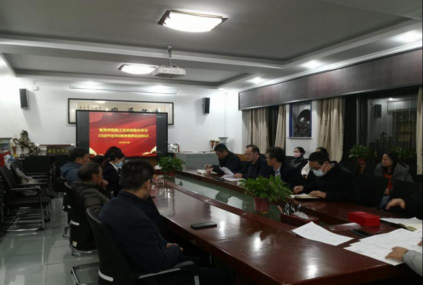 教工党支部在101会议室举行集体学习会,专题学习习近平总书记教育重要论述讲义,并结合个人思想工作情况开展交流讨论。教工党支部书记李春迪主持学习会,教工党支部全体党员参加学习。