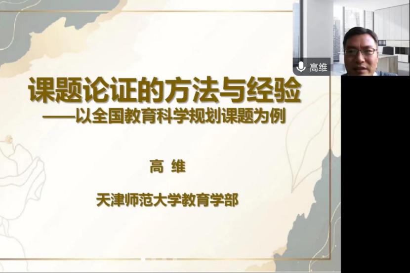 “博笃讲堂”系列主题报告会以线上、线下相结合的方式于学院101会议室成功举办。本次报告会特邀天津师范大学教育学部高维教授作题为《课题论证的方法与经验——以全国教育科学规划课题为例》的学术报告。报告会由品凤楼